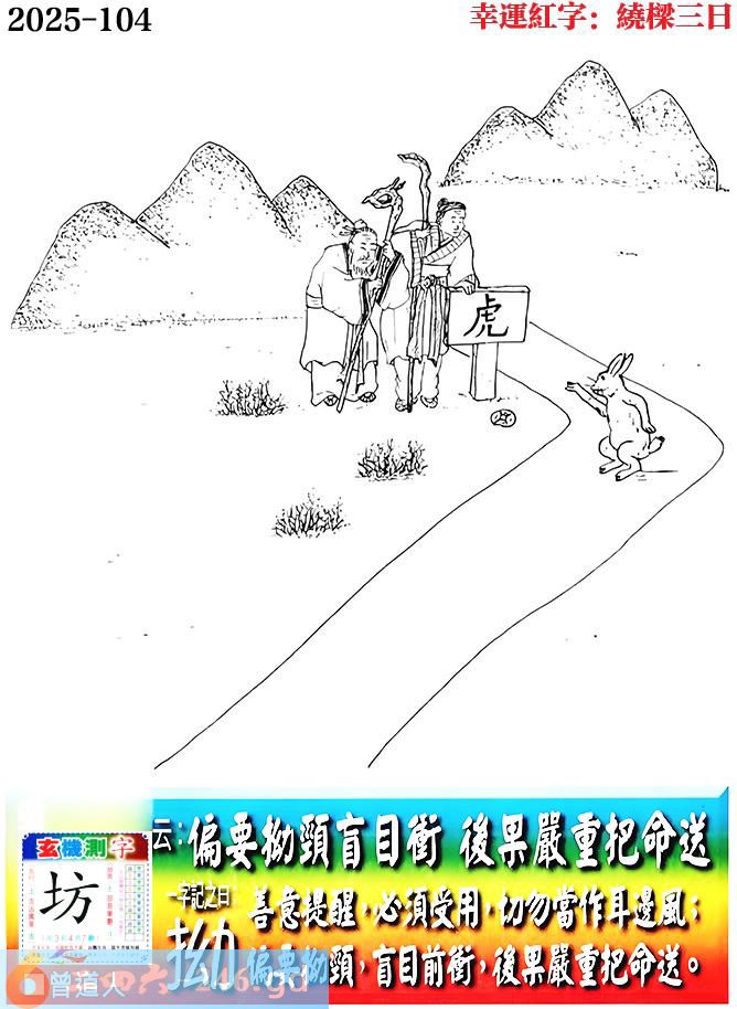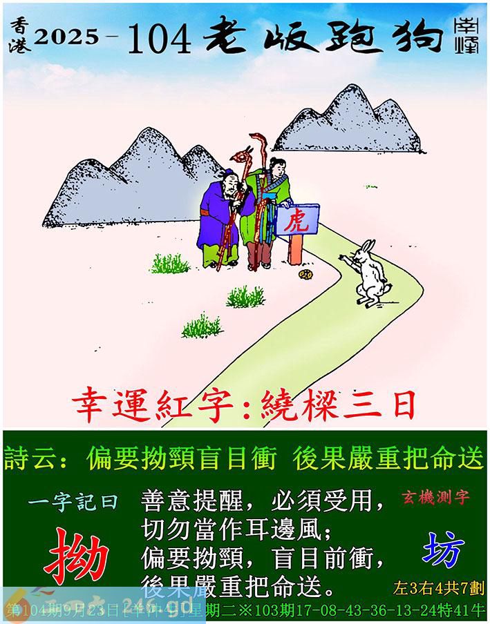 104期老版跑狗一字記之曰:【拗】 詩雲:偏要拗頸盲目衝,後果嚴重把命送。