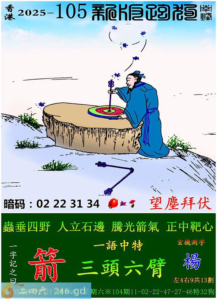 105期跑狗一字記之曰:【箭】 蟲垂四野,人立石邊。 騰光箭氣,正中靶心。