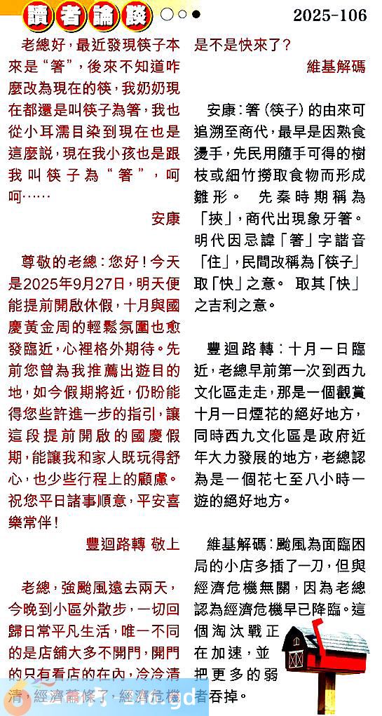 3.老總,強颱風遠去兩天,今晚到小區外散步,一切回歸日常平凡生活,唯一不同的是店鋪大多不開門,開門的只有看店的在內,冷冷清清,經濟蕭條了,經濟危機是不是快來了?維基解碼