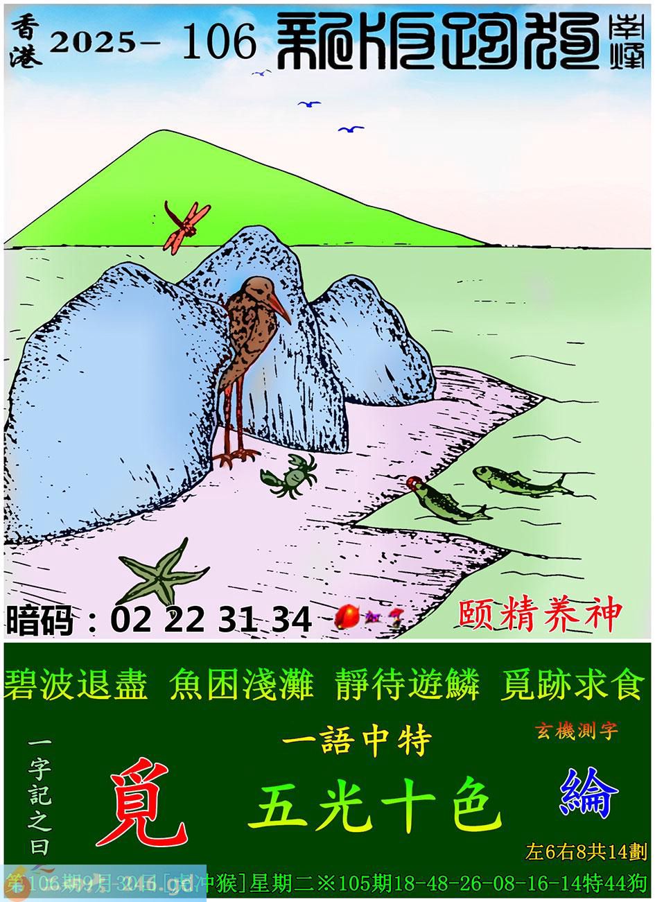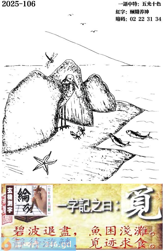 106期跑狗一字記之曰:【覓】 碧波退盡,魚困淺灘。 靜待遊鱗,覓跡求食。