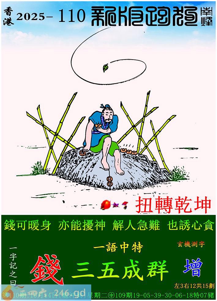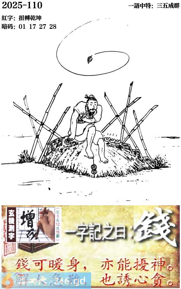 110期跑狗一字記之曰:【錢】 錢可暖身,亦能擾神。 解人急難,也誘心貪。