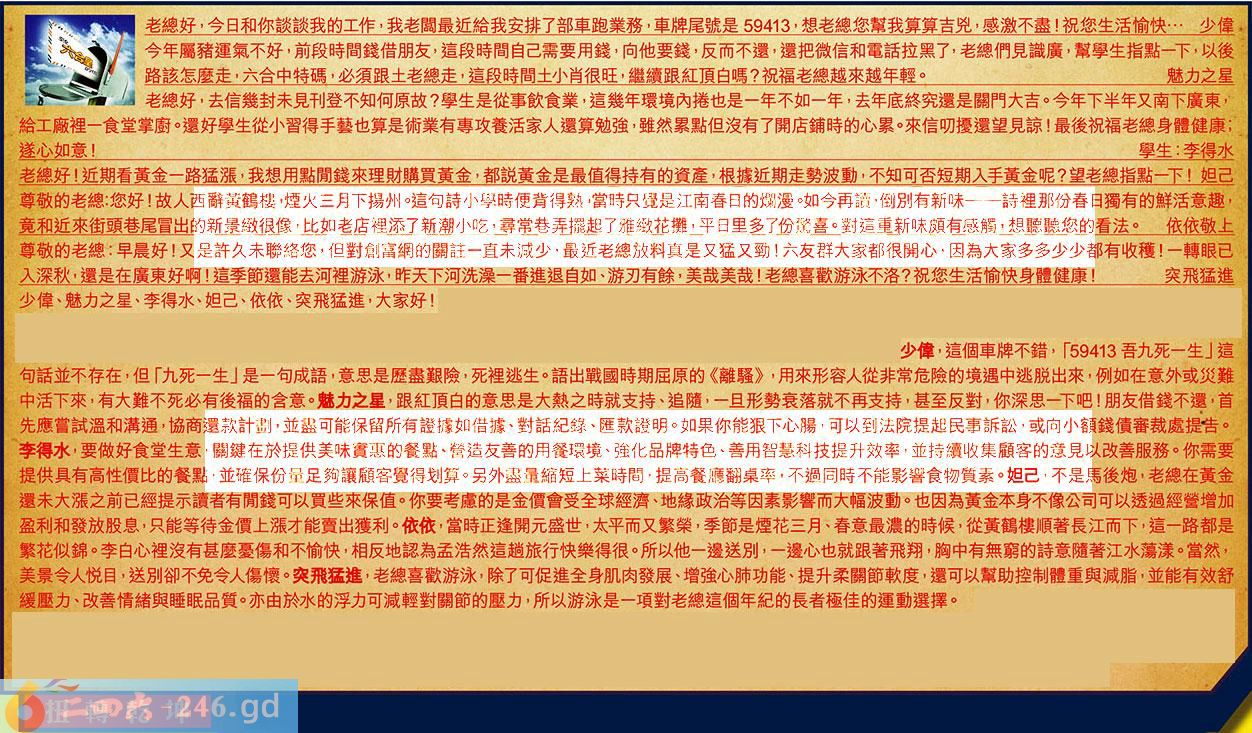 【1】.老總好,今日和你談談我的工作,我老闆最近給我安排了部車跑業務,車牌尾號是59413,想老總您幫我算算吉兕,感激不盡!祝您生活愉快...少偉