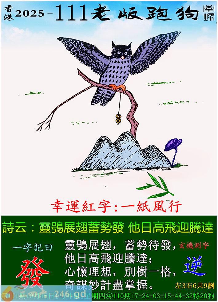 111期老版跑狗一字記之曰:【發】 詩雲:靈鴞展翅蓄勢發,他日高飛迎騰達。