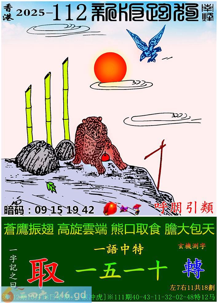 112期跑狗一字記之曰:【取】 蒼鷹振翅,高旋雲端。 熊口取食,膽大包天。
