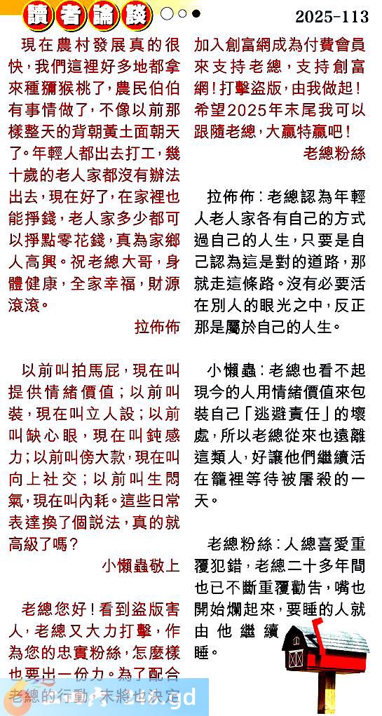 3.老總您好!看到盗版害人,老總又大力打擊,作為您的忠實粉絲,怎麼樣也要出一份力。為了配合老總的行動,末將也決定加入創富網成為付費會員來支持老總,支持創富網!打擊盗版,由我做起!希望2025年末尾我可以跟隨老總,大赢特赢吧!老總粉絲
