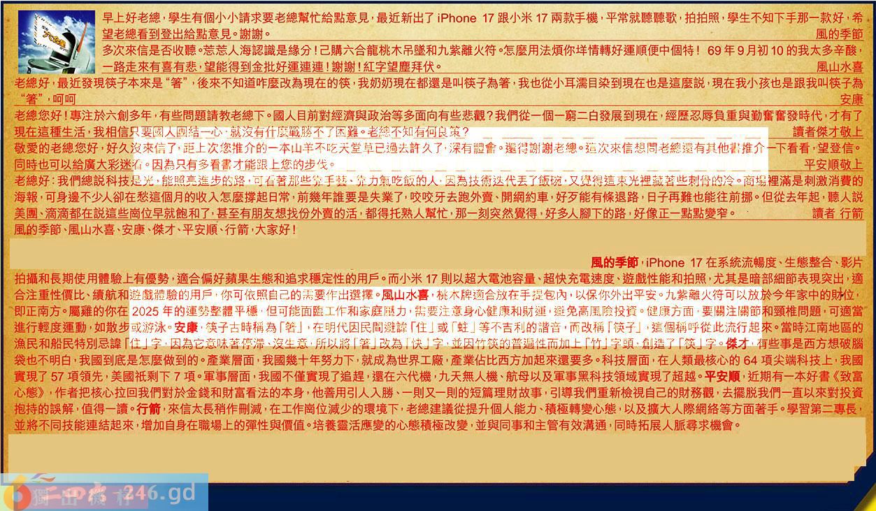 第113期《六合皇信箱文字版》10000%正確!!!正版二四六論壇*精心製作!!! 風的季節、風山水喜、安康、傑才、平安順、行箭,大家好! 【1】.早上好老總,學生有個小小請求要老總幫忙給點意見,最近新出了17跟小米17兩款手機,平常就聽聽歌,拍拍照,學生不知下手那一款好,希望老總看到登出給點意見。謝謝。風的季節 〖風的季節〗:17在系統流暢度、生態整合、影片拍攝和長期使用體驗上有優勢,適合偏好蘋果生態和追求穩定性的用戶。而小米17則以超大電池容量、超快充電速度、遊戲性能和拍照,尤其是暗部細節表現突出,適合注重性價比、續航和遊戲體驗的用户,你可依照自己的需要作出選擇。 【2】.多次來信是否收聽。莣莣人海認識是緣分!己購六合龍桃木吊墜和九紫離火符。怎麼用法煩你垟情轉好運順便中個特!69年9月初10的我太多辛酸,一路走來有喜有悲,望能得到金批好運連連!謝謝!紅字望塵拜伏。風山水喜 〖風山水喜〗:桃木牌適合放在手提包內,以保你外出平安。九紫離火符可以放於今年家中的財位,即正南方。屬雞的你在2025年的運勢整體平穩,但可能面臨工作和家庭壓力,需要注意身心健康和財運避免高風險投資。健康方面,要關注關節和頸椎問題,可適當進行輕度運動,如散步或游泳。 【3】.老總好,最近發現筷子本來是“箸”,後來不知道咋麼改為現在的筷,我奶奶現在都還是叫筷子為箸,我也從小耳濡目染到現在也是這麼說,現在我小孩也是跟我叫筷子為“箸”,呵呵安康 〖安康〗:筷子古時稱為「箸」,在明代因民間避諱「住」或「[蛀」等不吉利的諧音,而改稱「筷子」,這個稱呼從此流行起來。當時江南地區的漁民和船民特別忌諱「住」字,因為它意味著停滯、沒生意,所以將「箸」改為「快」字,並因竹筷的普遍性而加上「竹」字頭,創造了「筷」字。 【4】.老總您好!專注於六創多年,有些問題請教老總下。國人目前對經濟與政治等多面向有些悲觀?我們從一個一窮二白發展到現在,經歷忍辱負重與勤奮奮發時代,才有了現在這種生活,我相信只要國人團結一心,就沒有什麼戰勝不了困難。老總不知有何良策?讀者傑才敬上 〖傑才〗:有些事是西方想破腦袋也不明白,我國到底是怎麼做到的。產業層面,我國幾十年努力下,就成為世界工廠,產業佔比西方加起來還要多。科技層面,在人類最核心的64項尖端科技上,我國實現了57項領先,美國衹剩下7項。軍事層面,我國不僅實現了追趕,還在六代機,九天無人機、航母以及軍事黑科技領域實現了超越。 【5】.敬愛的老總您好,好久沒來信了,距上次您推介的一本山羊不吃天堂草已過去許久了,深有體會。還得謝謝老總。這次來信想問老總還有其他書推介一下看看,望登信。同時也可以給廣大彩迷看。因為只有多看書才能跟上您的步伐。平安順敬上 〖平安順〗:近期有一本好書《致富心態》,作者把核心拉回我們對於金錢和財富看法的本身,他善用引人入勝、一則又一則的短篇理財故事,引導我們重新檢視自己的財務觀,去擺脱我們一直以來對投資抱持的誤解,值得一讀。 【6】.老總好:我們總說科技是光能照亮進步的路,可看著那些靠手藝、靠力氣吃飯的人,因為技術迭代丟了飯碗,又覺得這束光裡藏著些刺骨的冷。商場裡滿是刺激消費的海報,可身邊不少人卻在愁這個月的收入怎麼撐起日常,前幾年誰要是失業了,咬咬牙去跑外賣、開網約車,好歹能有條退路,日子再難也能往前挪。但從去年起,聽人說美團、滴滴都在說這些崗位早就飽和了,甚至有朋友想找份外賣的活,都得托熟人幫忙,那一刻突然覺得,好多人腳下的路,好像正一點點變窄。讀者行箭 〖行箭〗:來信太長稍作刪減,在工作崗位減少的環境下,老總建議從提升個人能力、積極轉變心態,以及擴大人際網絡等方面著手。學習第二專長,並將不同技能連結起來,增加自身在職場上的彈性與價值。培養靈活應變的心態積極改變,並與同事和主管有效溝通,同時拓展人脈尋求機會。 紅字:獨出機杼 暗码:17192636 [释义]比喻文章的命题和构思独特新颖,与众不同。 [出处]《北史·祖莹传》:“作文须自出机杼,或一家风骨,何能共人同生活也。”