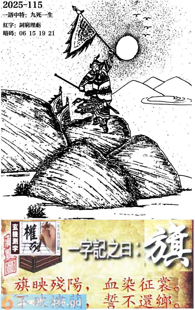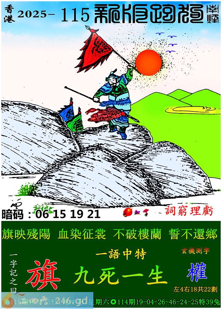 115期跑狗一字記之曰:【旗】 旗映殘陽,血染征裳。 不破樓蘭,誓不還鄉。