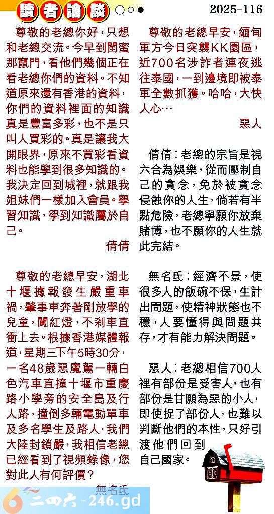 1.尊敬的老總你好,只想和老總交流。今早到閨蜜那竄門,看他們幾個正在看老總你們的資料。不知道原來還有香港的資料,你們的資料裡面的知識真是豐富多彩,也不是只叫人買彩的。真是讓我大開眼界,原來不買彩看資料也能學到很多知識的。我決定回到城裡,就跟我姐妹們一樣加入會員。學習知識,學到知識屬於自己。倩倩