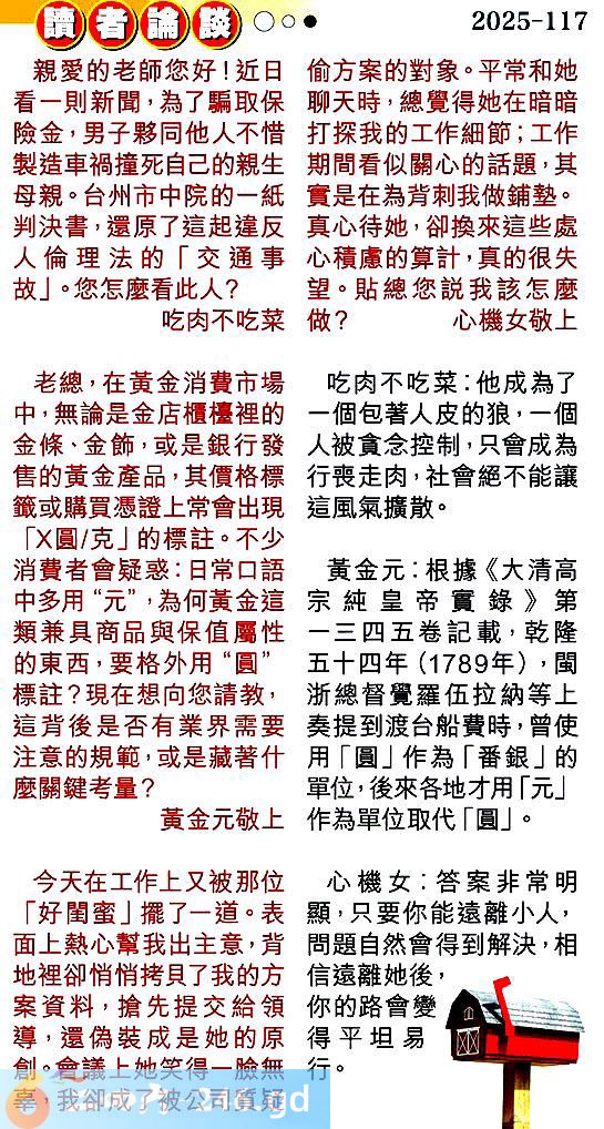 2.老總,在黃金消费市場中,無論是金店櫃檀裡的金條、金飾,或是銀行發售的黃金產品,其價格標簌或購買憑證上常會出現::「圓/克」的標註。不少消费者會疑惑:日常口語中多用“元”,為何黃金這類兼具商品與保值屬性的東西,要格外用“圆標註?現在想向您請教,這背後是否有業界需要注意的規範,或是藏著什麼關鍵考量?黃金元敬上