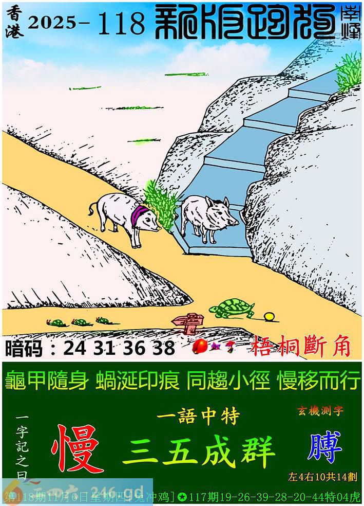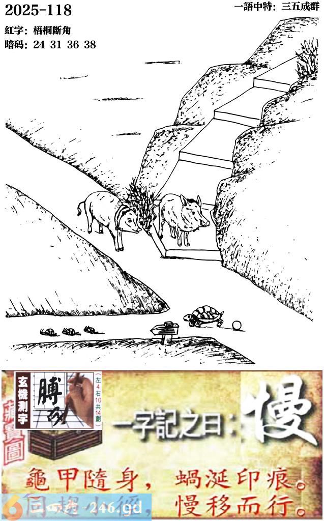 118期跑狗一字記之曰:【慢】 龜甲隨身,蝸涎印痕。 同趨小徑,慢移而行。