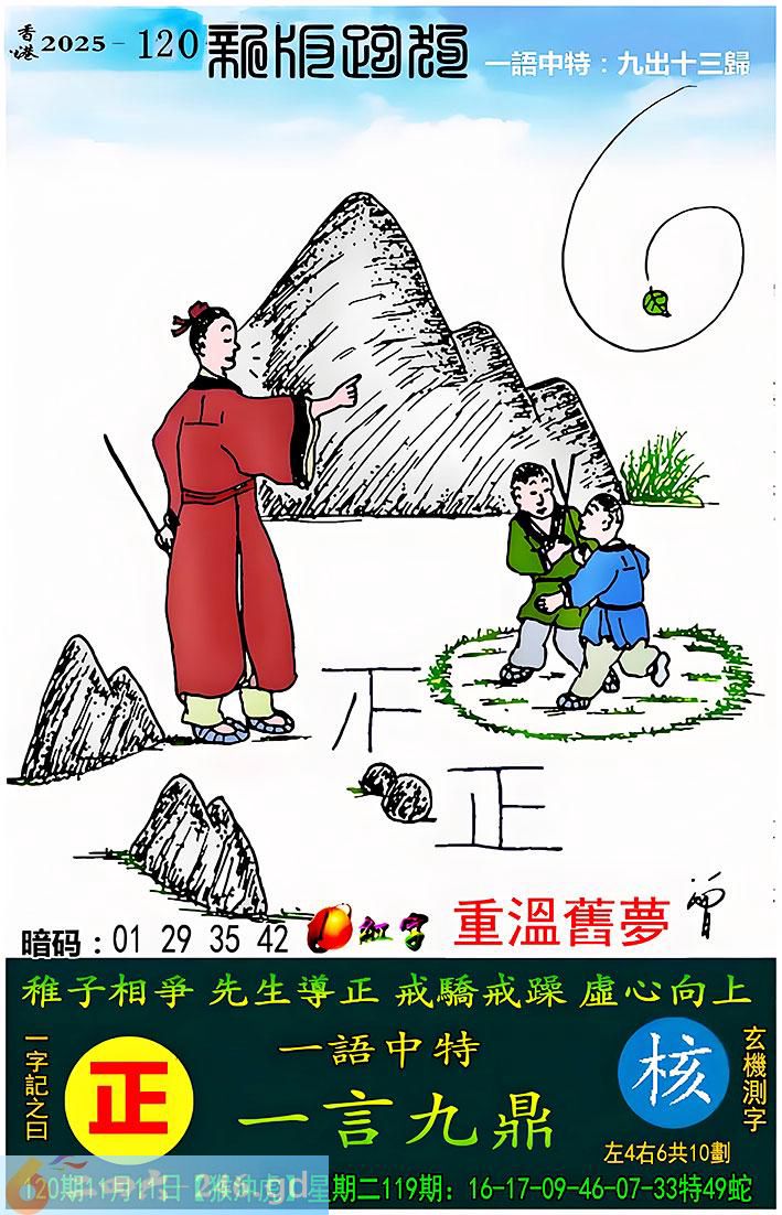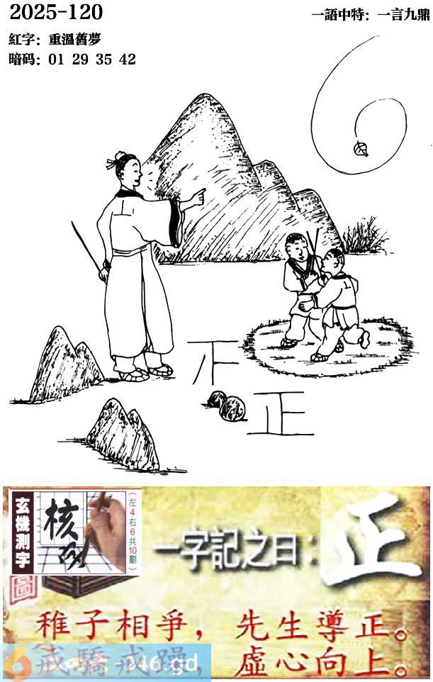 120期跑狗一字記之曰:【正】 稚子相爭,先生導正。 戒驕戒躁,虛心向上。