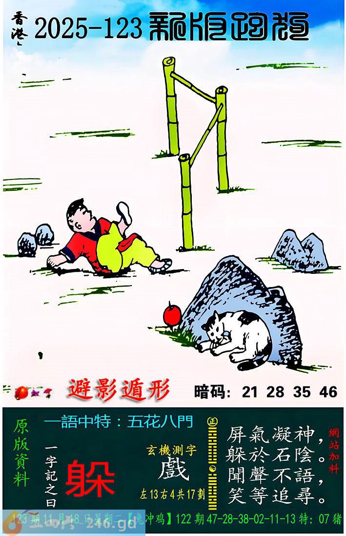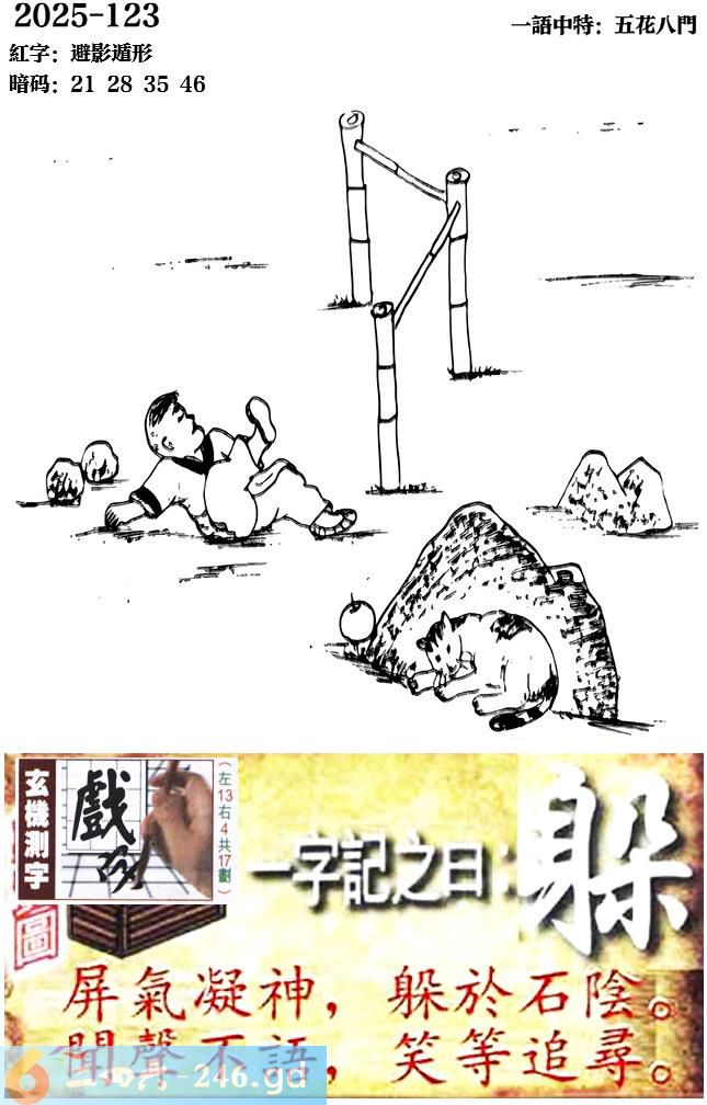 123期跑狗一字記之曰:【躲】 屏氣凝神,躲於石陰。 聞聲不語,笑等追尋。