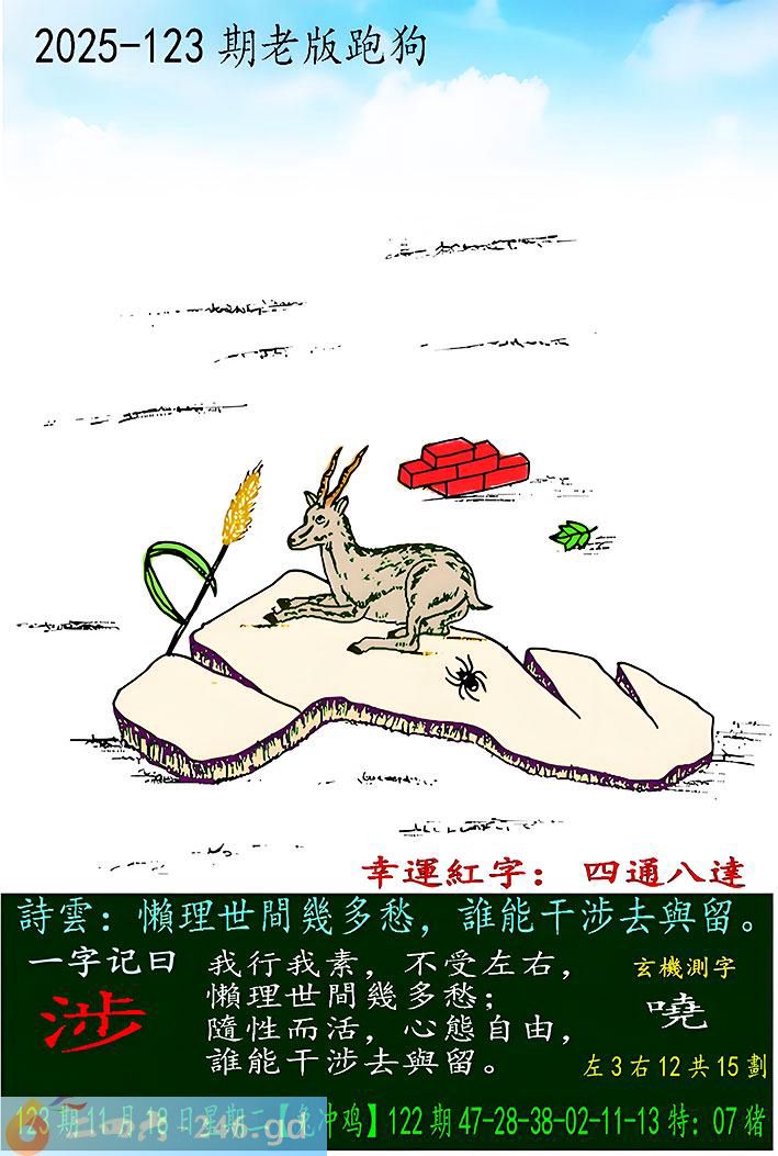 123期老版跑狗一字記之曰:【涉】 詩雲:懶理世間幾多愁,誰能干涉去與留。