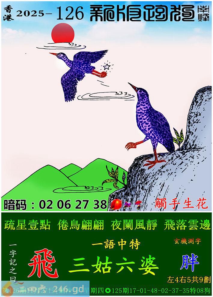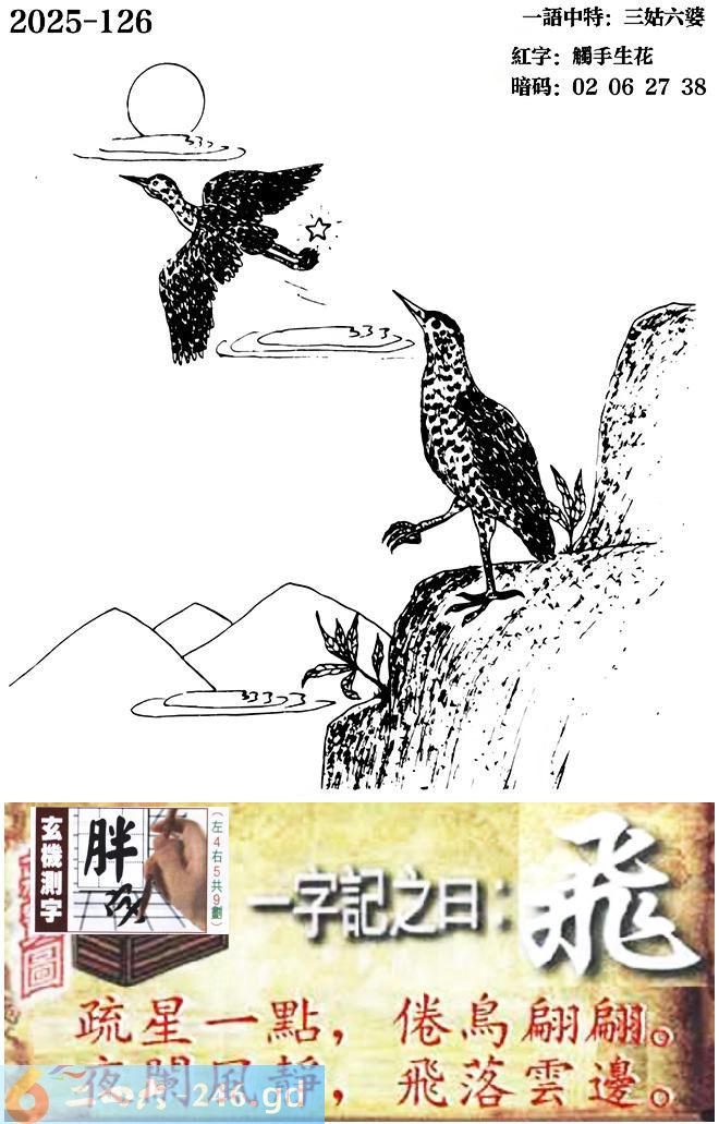 126期跑狗一字記之曰:【飛】 疏星壹點,倦鳥翩翩。 夜闌風靜,飛落雲邊。