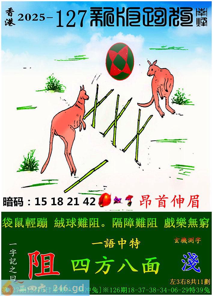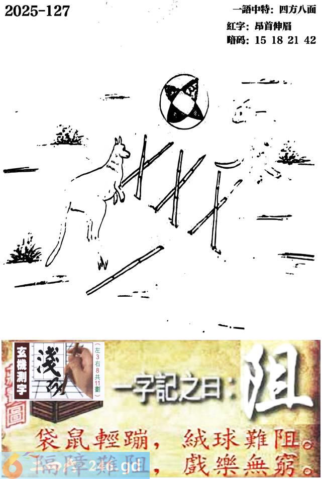 127期跑狗一字記之曰:【阻】 袋鼠輕蹦,絨球難阻。 隔障難阻,戲樂無窮。