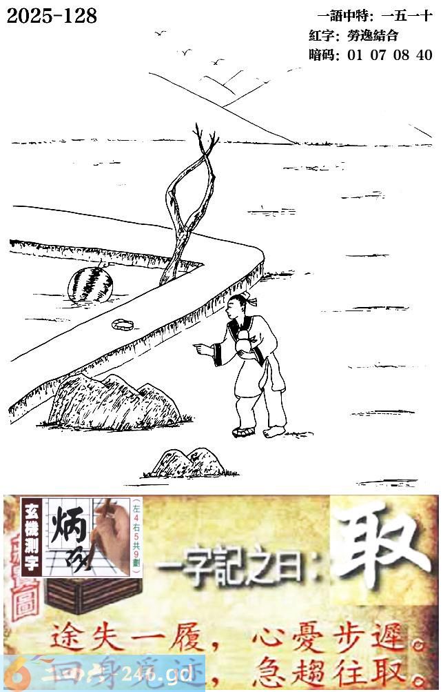 128期跑狗一字記之曰:【取】 途失壹履,心憂步遲。 回身覓跡,急趨往取。