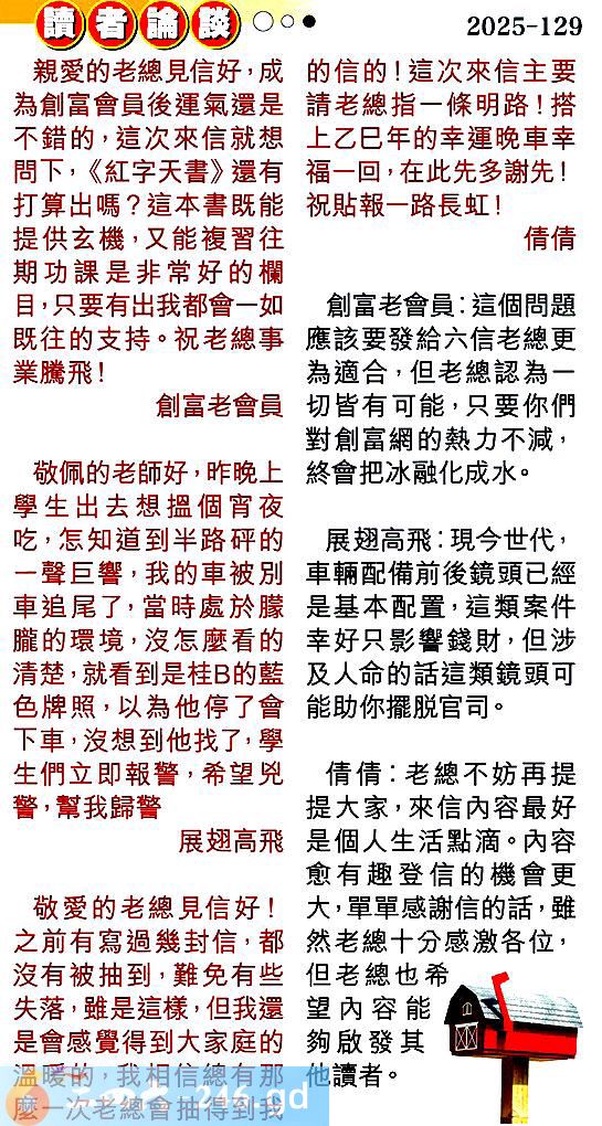 3.敬愛的老總見信好!之前有寫過幾封信,都沒有被抽到,難免有些失落,雖是這樣,但我還是會感覺得到大家庭的溫暖的,我相信總有那麼一次老總會抽得到我的信的!這次來信主要請老總指一條明路!搭上乙巳年的幸運晚車幸福一回,在此先多謝先!祝貼報一路長虹!倩倩