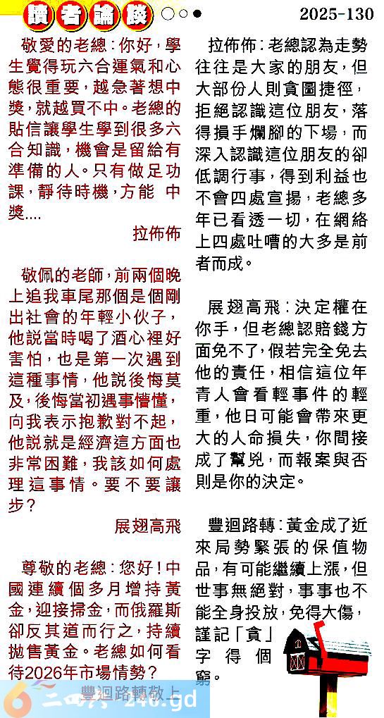 130期:彩民推荐〖貼信讀者論壇〗