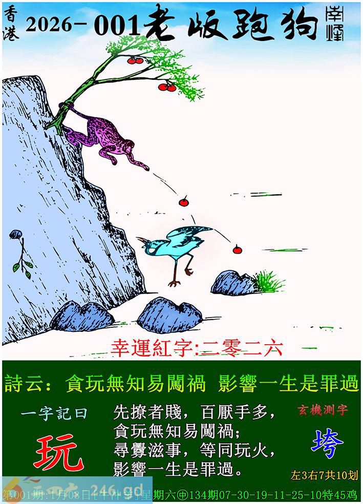 001期老版跑狗一字記之曰:【玩】 詩雲:貪玩無知易闖禍,影響一生是罪過。