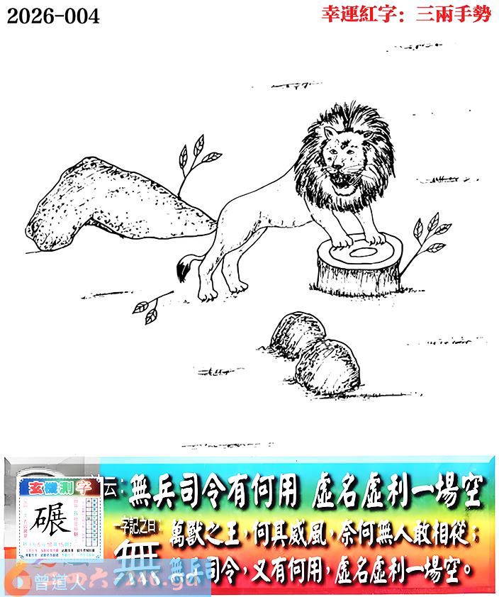 004期老版跑狗一字記之曰:【無】 詩雲:無兵司令有何用,虛名虛利一場空。