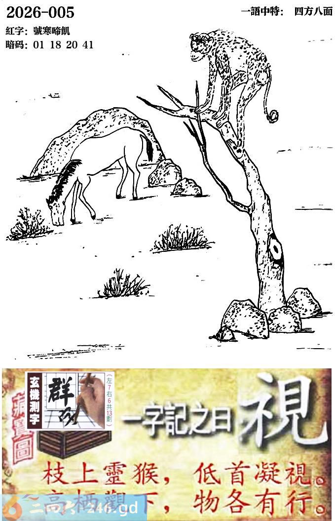 005期跑狗一字記之曰:【視】 枝上靈猴,低首凝視。 高棲觀下,物各有行。