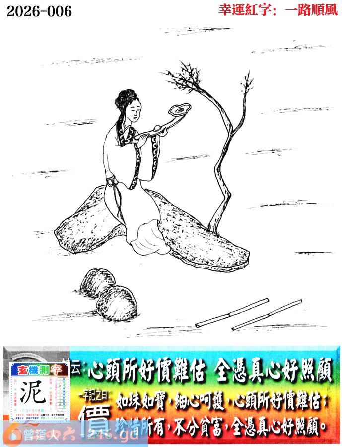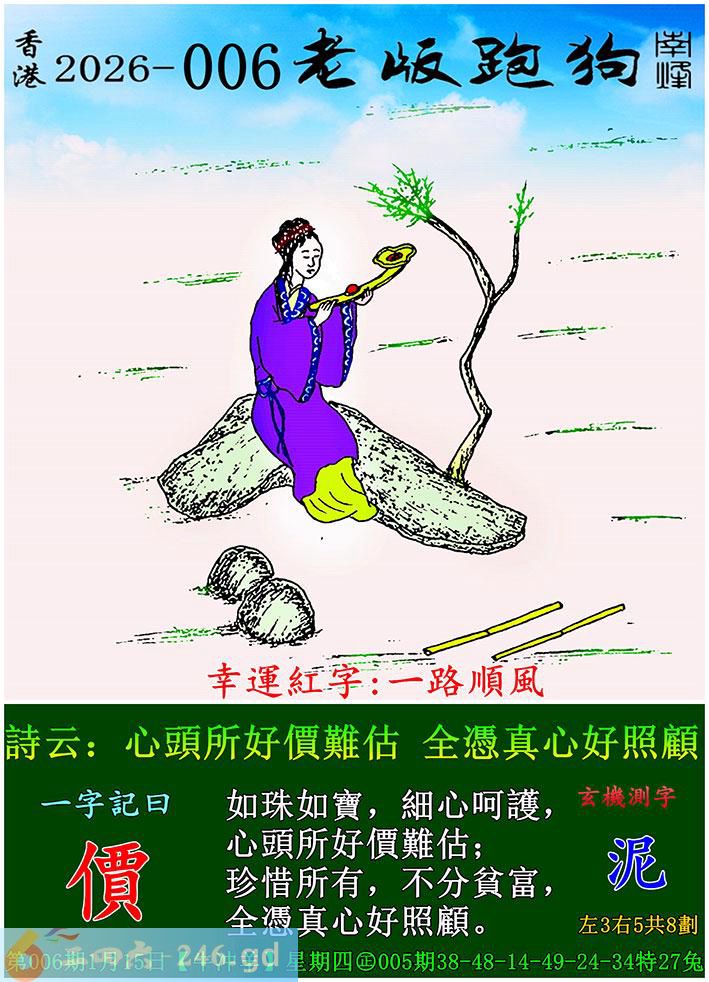 006期老版跑狗一字記之曰:【價】 詩雲:心頭所好價難估,全憑真心好照顧。