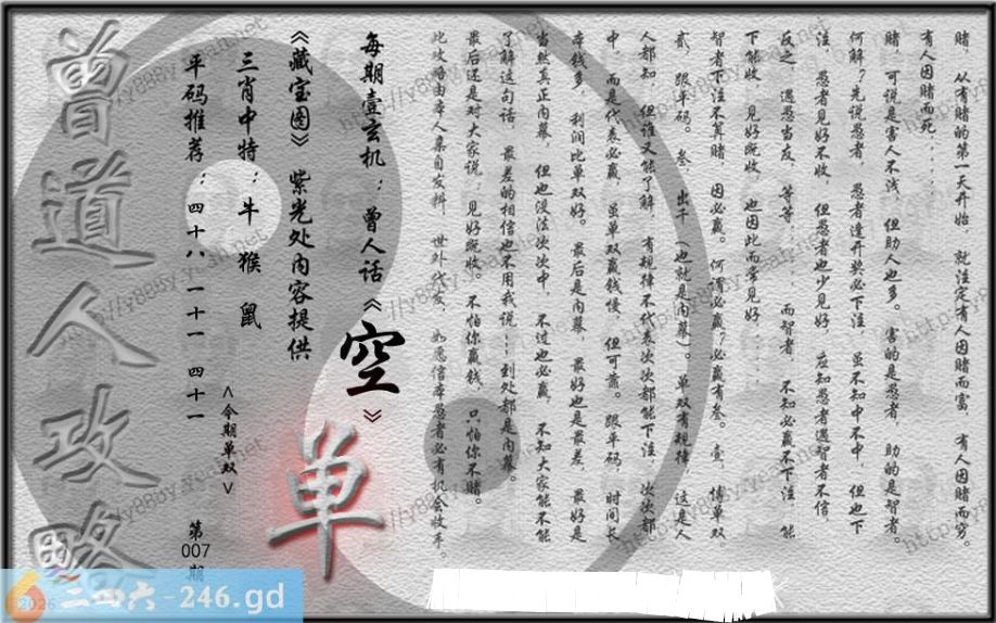 007期藏寶圖 新:已陪沁水追欢日 老:少小虽非投笔吏 禁:猪 禁:2尾 玄機字:《空》