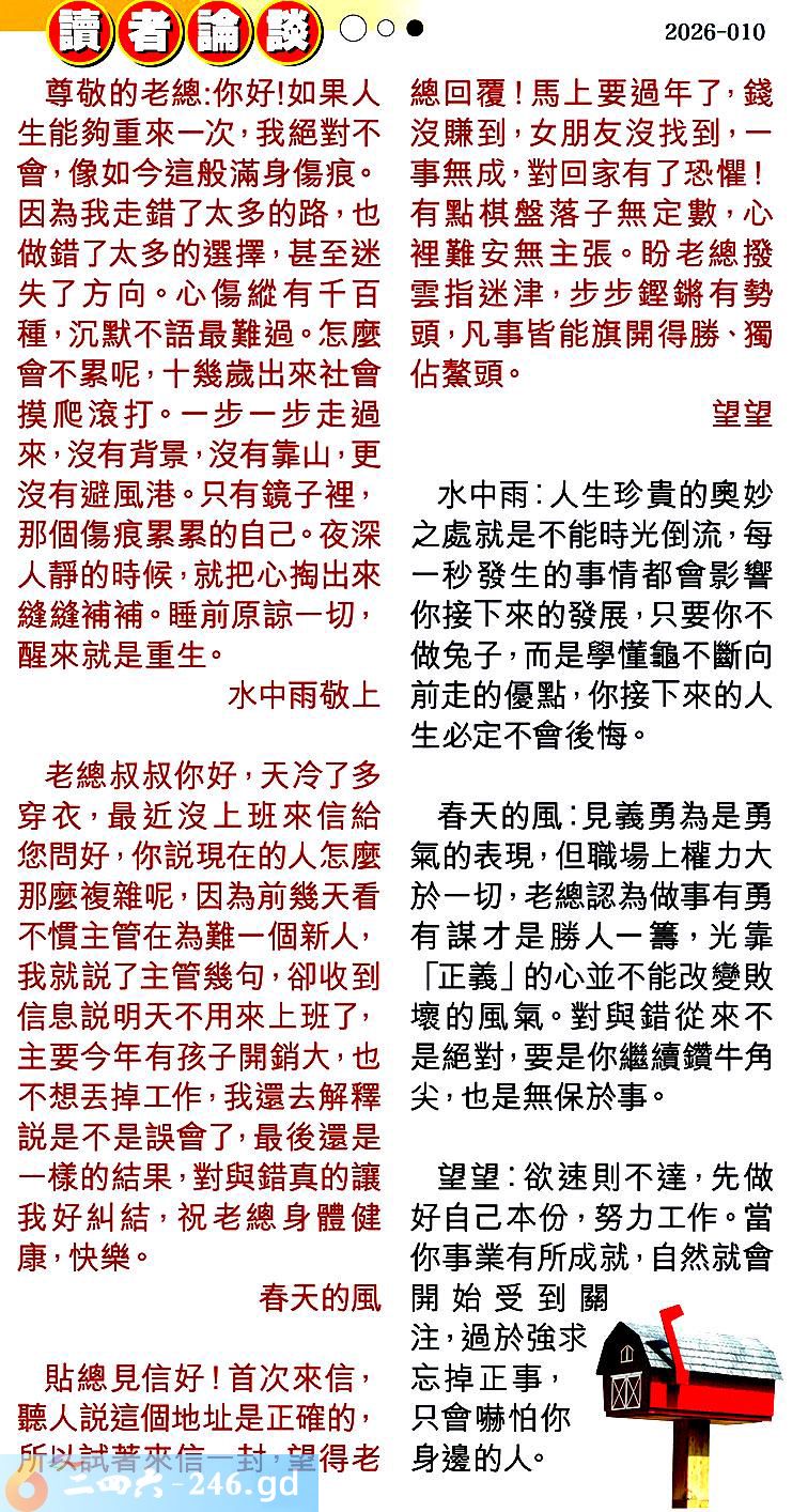 3.貼總見信好!首次來信,聽人説這個地址是正確的,所以試著來信一封,望得老總回覆!馬上要過年了,錢沒赚到,女朋友沒找到,一事無成,對回家有了恐懼!有點棋盤落子無定數,心裡難安無主張。盼老總撥雲指迷津,步步鏗鏘有勢頭,凡事皆能旗開得勝、獨佔鰲頭。望望