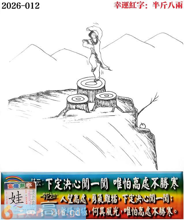 012期老版跑狗一字記之曰:【高】 詩雲:下定決心闖一闖,唯怕高處不勝寒。