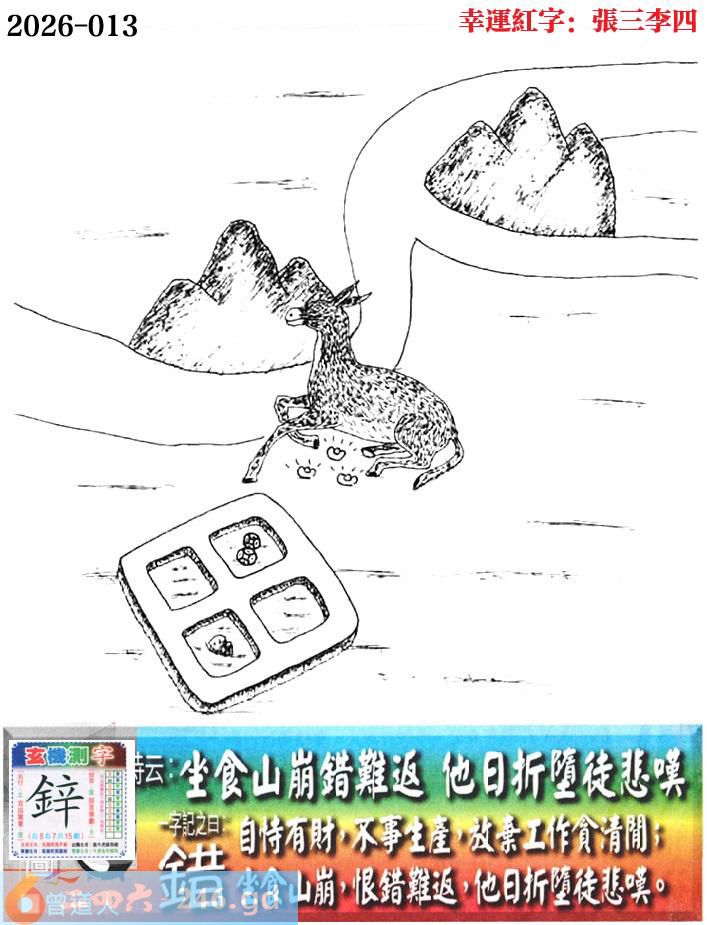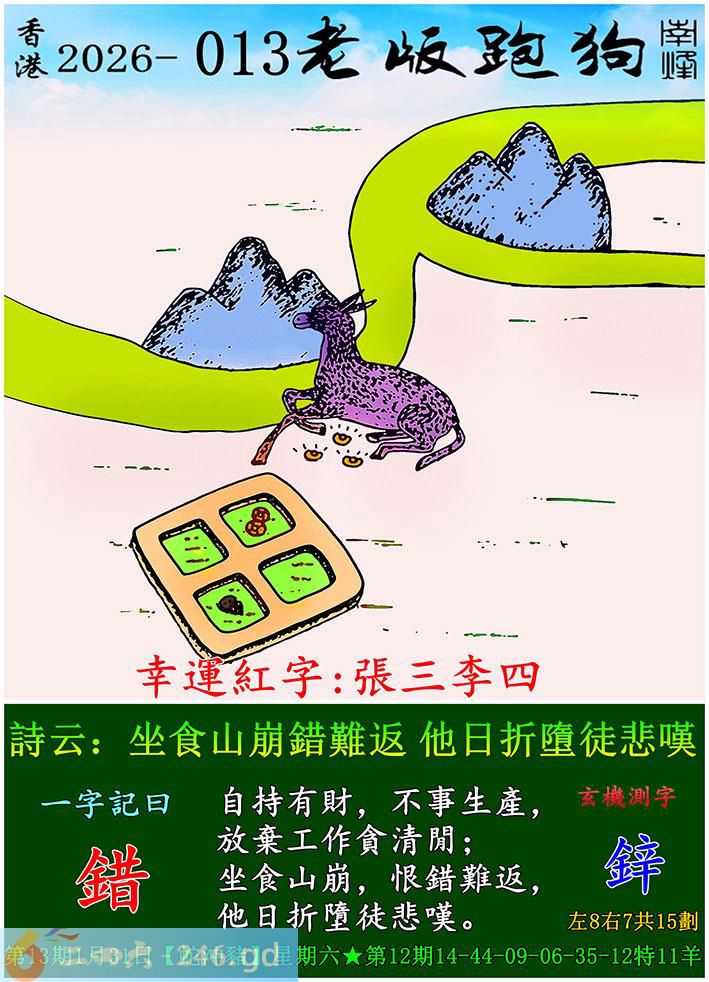 013期老版跑狗一字記之曰:【錯】 詩雲:坐食山崩錯難返,他日折墮徒悲嘆。