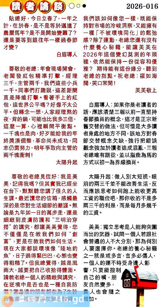 第016期讀者論談 1.貼總好,今日立春了,一年之計,在於春,是不是等於邁進了農曆馬年?是不是開始變蕭了?還是要等到跟往年一樣過春節才變?白眉導人 〖白眉導人〗:如果你是老讀者的話,應該清楚三報以前一直堅持春節换肖的概念,這才是正宗新舊交替的做法,但可惜是大多讀者身處的地方不同,該地方對春節交替概念欠缺,強行把錯誤觀念強加於讀者造成混亂,三報老總唯有跟從,並以指鹿為馬的方式以初一為界線換肖。 2.尊敬的老總:年會現場開會,老闆發紅包精準打擊,經理三千,主管兩千,我們這些小兵千。同事們打趣说,這差距簡直是降維打擊。看著手上的紅包,這世界公平嗎?好像不太公平。但轉念一想,人家經理熬的夜背的鍋,可能也比我多三倍,這麼一算心裡瞬間平衡點。一千塊也是肉,好歹能給我的年終獎凑個整,革命尚未成功,同志仍需努力明年爭取向主管的兩千塊衝刺!太陽升起 〖太陽升起〗:做人別太短視,眼前的兩三千並不能改善生活,反而應該思考如何跑上能收更高工資的職位吧,那你收的不是多兩三千的利是,而是每月多幾千的工資。 3.尊敬的老總見信好:我是美美,記得我嗎?但其實我已經坐在台下,默默聽您講了很久的人生課。最近讀您的信箱,感觸最深的是您對生活細節的嚴謹。無論是九年如一日的萬步走,還是細緻到皮膚防護和“三明治穿搭”的講究,都讓美美覺得,您不僅僅是在教我們如何“創富”,更是在教我們如何生活。現在大家都説環境像“陸地釣魚”,日子過得緊巴巴,心態也變得粗糙了。但我總覺得,越是風雨大,越要把自己收拾得體面。請教老總一個人的精與講究,在逆境中是否也是一種自我防禦?當身邊的朋友都在為了生計而焦慮、甚至變得灰頭土臉時,我們該如何像您一樣,既能保持對市場的冷峻洞察,又能擁有一種「不被環境同化」的鬆弛感?除了運動,老總您還有沒有什麼養心秘籍,能讓美美在2026年這個變幻莫測的年頭裡,依然能保持一份從容和優雅?期待能有這份緣分,聽到老總的指點。祝老總:福如海闊,笑口常開!美美敬上 〖美美〗:獨立思考是人能夠突圍而出的武器,試問一個人若跟社會普遍的人不大分別,那為何別人要選擇你。老總的養心秘籍之一就是戒多言,言多必傷人,一個人的運不時受身邊人影響,只要能控制自己的嘴,朋友自然變多,貴人也會隨之增加。