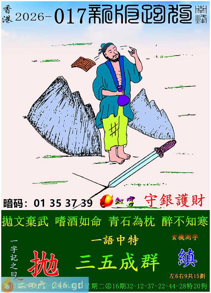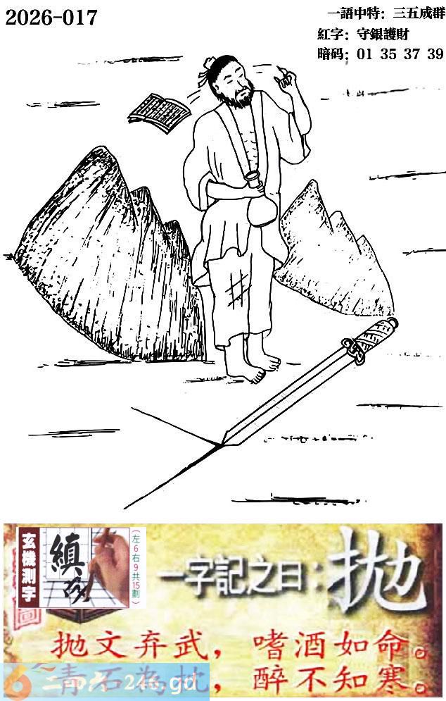 017期跑狗一字記之曰:【拋】 拋文棄武,嗜酒如命。 青石為枕,醉不知寒。