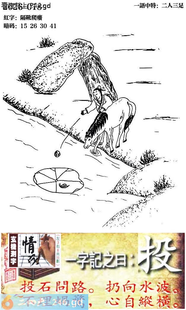 018期跑狗一字記之曰:【投】 投石問路。扔向水波。 不理蝸驚,心自縱橫。
