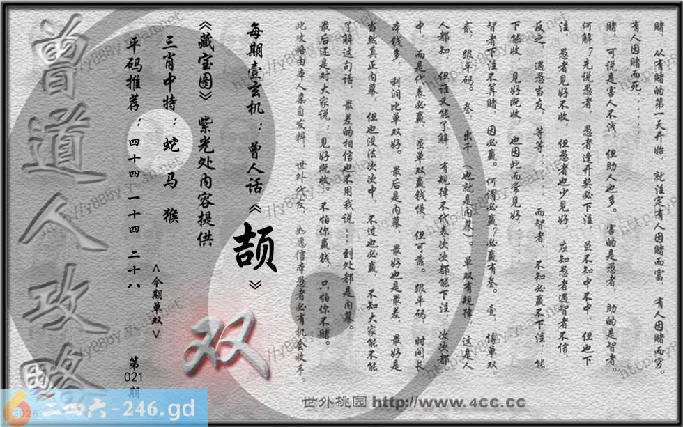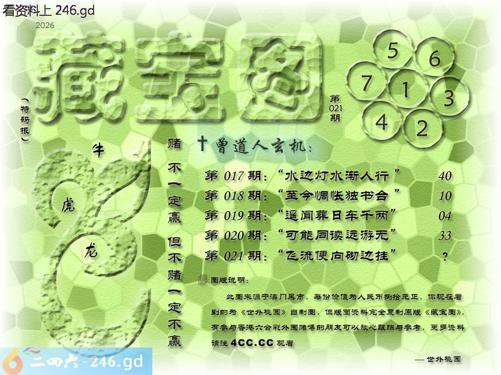 021期藏寶圖 新:飞流便向砌边挂 老:锦袖歌残翠黛尘 禁:兔 禁:0尾 玄機字:《颉》