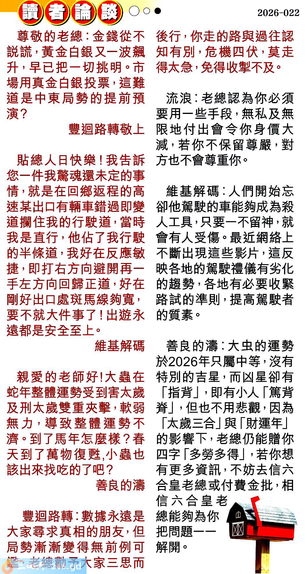 022期:彩民推荐〖貼信讀者論壇〗