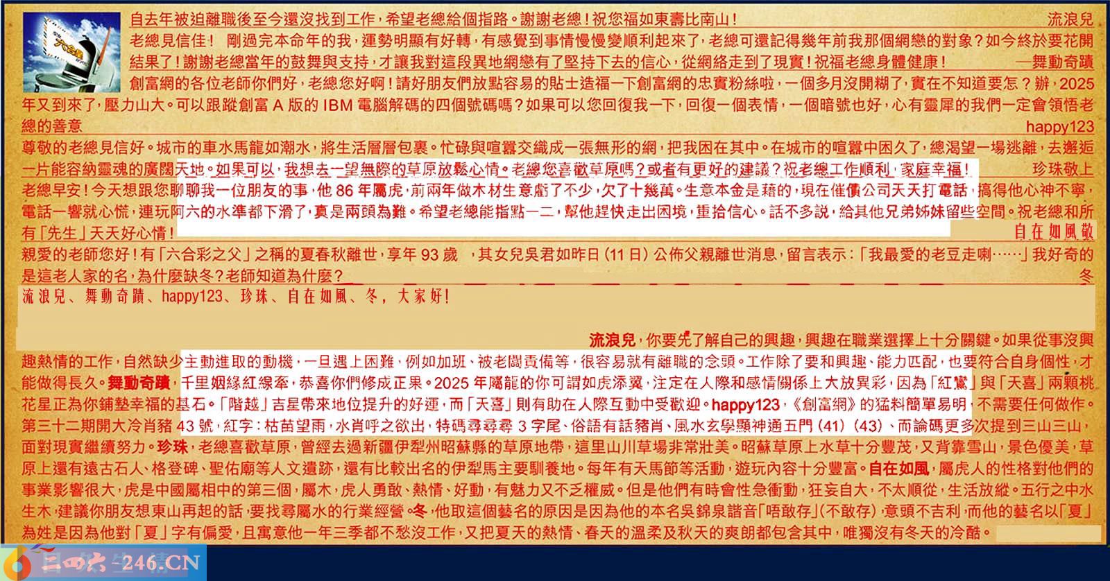 第037期《六合皇信箱文字版》10000%正確!!!正版二四六論壇*精心製作!!! 流浪兒、舞動奇蹟、123、珍珠、自在如風、冬,大家好! 【1】.自去年被迫離職後至今還沒找到工作,希望老總給個指路。謝謝老總!祝您福如東壽比南山!流浪兒 〖流浪兒〗:你要先了解自己的興趣,興趣在職業選擇上十分關鍵。如果從事沒興趣熱情的工作,自然缺少主動進取的動機,一旦遇上困難,例如加班、被老闆責備等,很容易就有離職的念頭。工作除了要和興趣、能力匹配也要符合自身個性,才能做得長久。 【2】.老總見信佳!剛過完本命年的我,運勢明顯有好轉,有感覺到事情慢慢變順利起來了,老總可還記得幾年前我那個網戀的對象?如今終於要花開結果了!謝謝老總當年的鼓舞與支持,才讓我對這段異地網戀有了堅持下去的信心,從網絡走到了現實!祝福老總身體健康!一舞動奇镇 〖舞動奇蹟〗:千里姻緣紅線牽,恭喜你們修成正果。2025年属龍的你可謂如虎添翼,注定在人際和感情關係上大放異彩,因為「紅鸞」與「天喜」兩顆桃花星正為你鋪墊幸福的基石。「階越」吉星帶來地位提升的好運,而「天喜」則有助在人際互動中受歡迎。 【3】.創富網的各位老師你們好,老總您好啊!請好朋友們放點容易的貼士造福一下創富網的忠實粉絲啦,一個多月沒開糊了,實在不知道要怎?辦,2025年又到來了,壓力山大。可以跟蹤創富版的電腦解碼的四個號碼嗎?如果可以您回復我一下,回復一個表情,一個暗號也好,心有靈犀的我們一定會領悟老總的善意123 〖123〗:《創富網》的猛料簡單易明,不需要任何做作。第三十二期開大冷肖豬43號,紅字:枯苗望雨,水肖呼之欲出,特碼尋尋尋3字尾、俗語有話猪肖、風水玄學顯神通五門(41)(43)、而論碼更多次提到三山三山,面對現實繼續努力。 【4】.尊敬的老總見信好。城市的車水馬龍如潮水,將生活層層包裹。忙碌與喧囂交織成一張無形的網,把我困在其中。在城市的喧囂中困久了,總渴望一場逃離,去邂逅一片能容纳靈魂的廣闊天地。如果可以,我想去一望無際的草原放鬆心情。老總您喜歡草原嗎?或者有更好的建議?祝老總工作順利,家庭幸福!珍珠敬上 〖珍珠〗:老總喜歡草原,曾經去過新疆伊犁州昭蘇縣的草原地帶,這里山川草場非常壯美。昭蘇草原上水草十分豐茂,又背靠雪山,景色優美,草原上還有遠古石人、格登碑、聖佑廟等人文遺跡,還有比較出名的伊犁馬主要馴養地。每年有天馬節等活動,遊玩內容十分豐富。 【5】.老總早安!今天想跟您聊聊我一位朋友的事,他86年属虎,前兩年做本材生意虧了不少,欠了十幾萬。生意不金是藉的,現在催價公司天天打電話,搞得他心神不寧,電話一響就心慌,連玩阿六的水準都下滑了,真是兩頭為難。希望老總能指點一二,幫他趕快走出困境,重拾信心。話不多說,給其他兄弟姊妹留些空間。祝老總和所有「先生」天天好心情!自在如風敬 〖自在如風〗:屬虎人的性格對他們的事業影響很大,虎是中國屬相中的第三個,屬木,虎人勇敢、熱情、好動,有魅力又不乏權威。但是他們有時會性急衝動,狂妄自大,不太順從,生活放縱。五行之中水生木,建議你朋友想東山再起的話,要找尋屬水的行業經營。 【6】.親愛的老師您好!有「六合彩之父」之稱的夏春秋離世,享年93歲,其女兒吳君如昨日(11日)公布父親離世消息,留言表示:「我最愛的老豆走喇......」我好奇的是這老人家的名,為什麼缺冬?老師知道為什麼?冬 〖冬〗:他取這個藝名的原因是因為他的本名吳錦泉諧音「唔敢存」(不敢存)意頭不利,而他的藝名以「夏」為姓是因為他對「夏」字有偏爱,且寓意他年三季都不愁沒工作,又把夏天的熱情、春天的温柔及秋天的爽朗都包含其中,唯獨沒有冬天的冷酷。 紅字:日久生情 暗码:01072136 [释义]相处的日子长了,自然会产生感情。